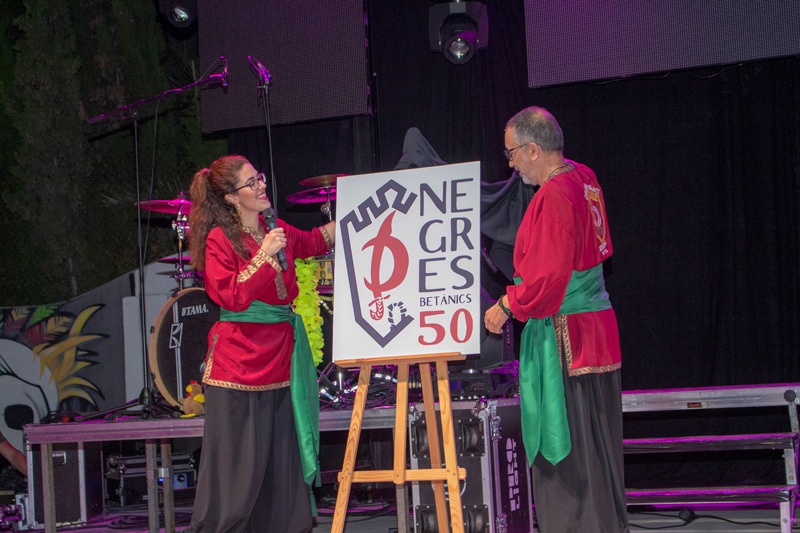Así que cuando se propuso hacer un concurso para el logo del 50 aniversario pensé que debía presentarme, pues era una oportunidad que no debía dejar escapar. Como mis conocimientos de diseño gráfico son limitados pensé que el logo debía ser una reinterpretación del escudo existente, que se identificara rápidamente con la comparsa y que añadiera la leyenda ‘Negres Betánics 50’ tal como exigían las bases. Fui dibujando bocetos a lápiz hasta llegar a uno que me convenció y que fuera capaz de plasmar en el ordenador, cortando la parte derecha del castillo y poniendo la palabra Negres separando las letras dos a dos en vertical, para que cuadrara con 50. La letra tenía que ser rotunda y con un toque antiguo, cosa que encontré en la fuente Avera Sans.